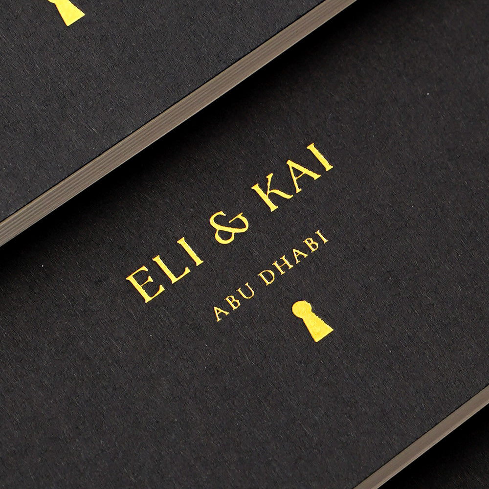 Cover: Black matte rigid card, gold-embossed Eli & Kai